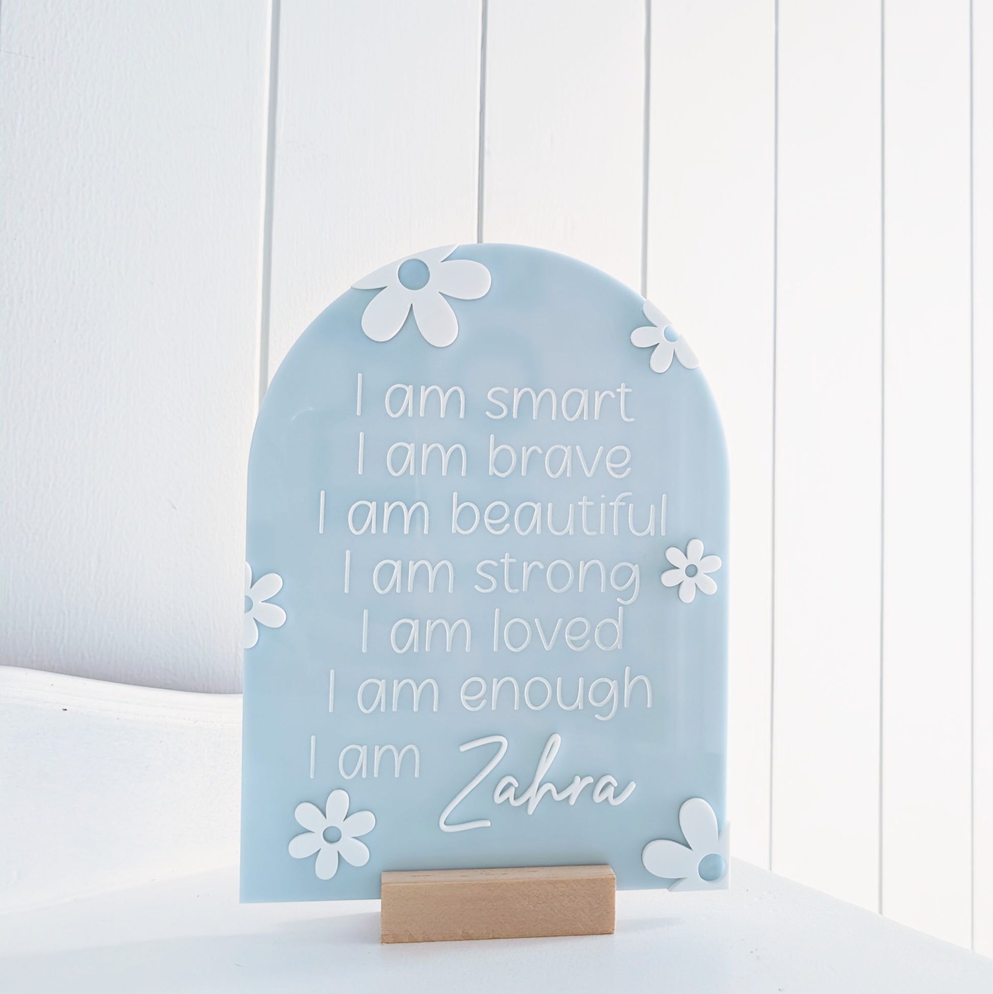 Our Personalised Daily Affirmation Plaque is a beautiful way to remind your child that they are capable and loved every day! Our Arch includes a wooden stand making it the perfect addition to their room to encourage them to start each day with a positive mindset.